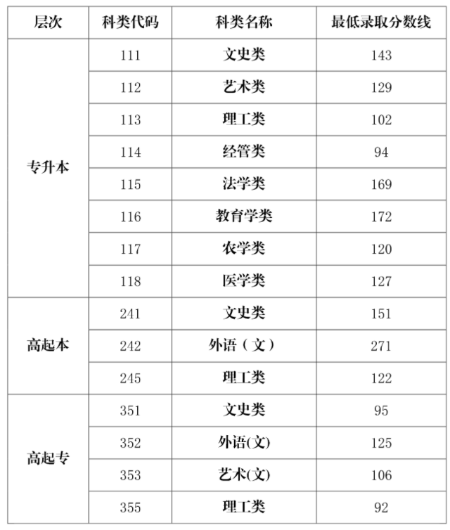 成考的最低录取控制分数线根据考生统考科目的成绩和招生院校招生计划数按科类划定,最低录取控制分数线报教育部备案。